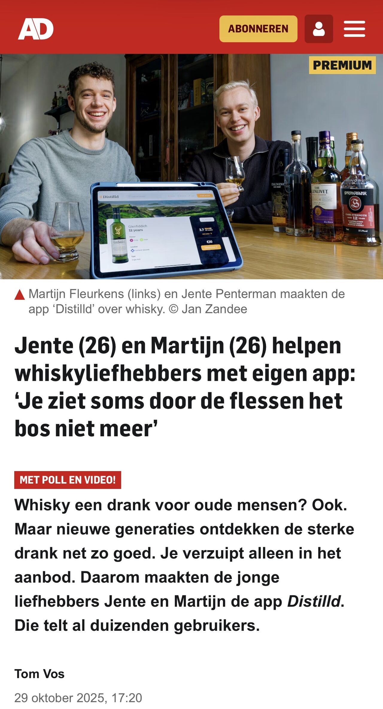 Dat werpt zijn vruchten af. Distilld telt inmiddels meer dan 13.000 gebruikers, behaalde een plek in de top 50 van de App Store rankings en werd uitgeroepen tot Whisky App of the Year 2025. Ook verschenen Jente en Martijn met hun verhaal in onder andere het Brabants Dagblad, Algemeen Dagblad, Eindhovens Dagblad en De Ondernemer.